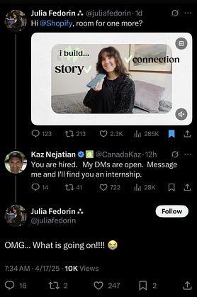 Just this week, Julia (a Waterloo student) posted a video highlighting her marketing skills to Shopify authentically.