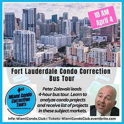 The Miami Condo Correction Tours™ is hosting a 4-hour bus tour of the Downtown Fort Lauderdale and Beach market at 10 am Saturday, April 4, 2026.
