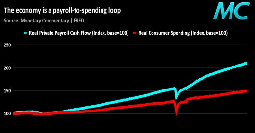The economy looks simple until payroll keeps rising while spending stops converting the same way.