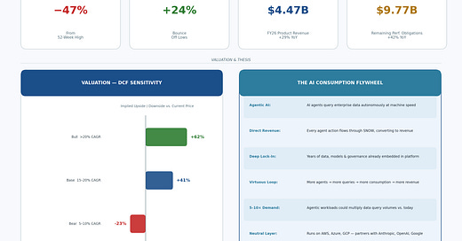The agentic AI demand multiplier is the variable I flagged in February as the open question — if every agent query flows through the consumption model, the RPO conversion math gets a lot more interesting than historical patterns suggest. The SBC shadow I called out at 34% of revenue is still the friction in the story, and the 47% pullback from the high doesn't resolve that unless dilution intensity actually starts declining. The prove-it framework still applies; the question now is whether the Q4 acceleration to 30% product revenue growth is the beginning of the answer.