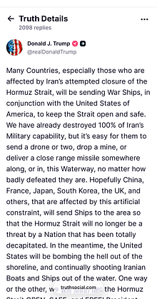 This Trump tweet is a work of art and needs to be kept for posterity. It turns out that the US has destroyed 100% of Iran’s military capability. Yet, to combat a military with no capability he is left pleading with allies he has regularly insulted to save him in the Gulf.