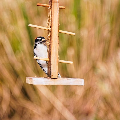 A shot from late November. A male Downy Woodpecker on a homemade bark butter feeder I put together from some scrap cedar plank wood.