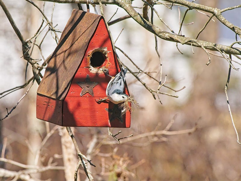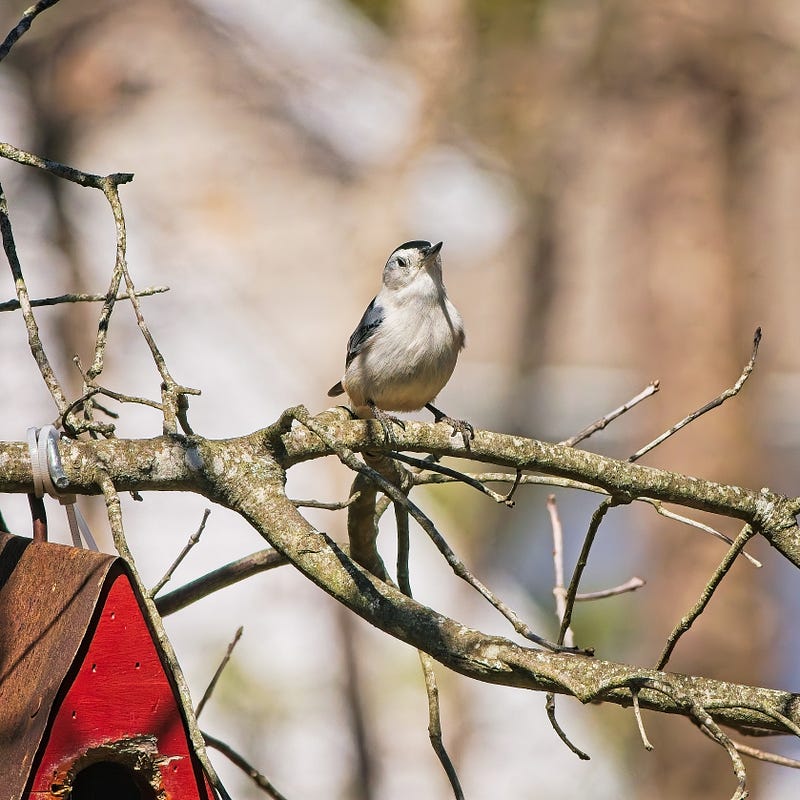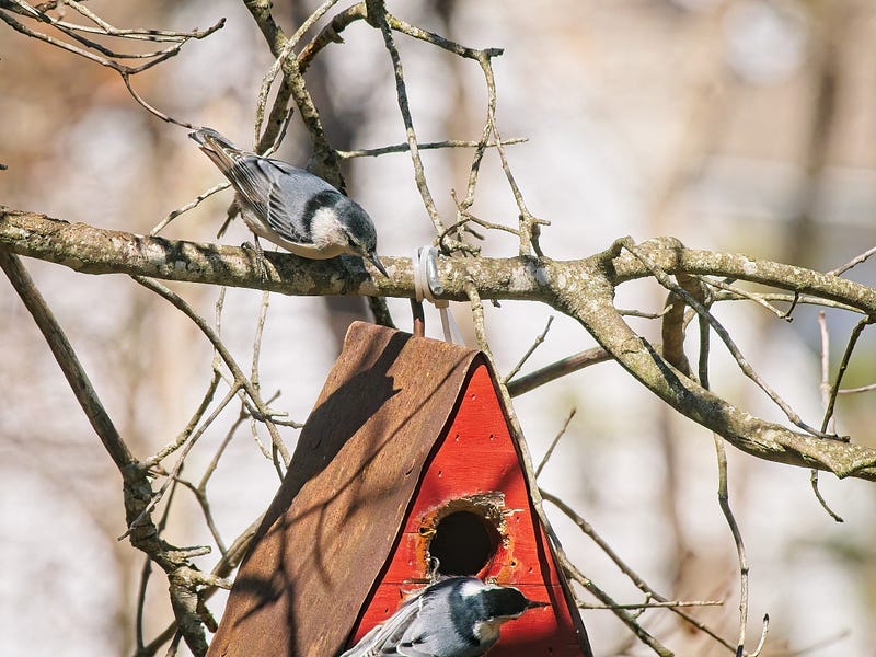 Earlier this morning I heard a distinctive “tap, tap, tap” of a beak on metal across the yard, where I noticed a nuthatch investigating the red nesting box that hangs from an oak branch. Some time ago I’d put a metal squirrel guard around the opening so that they couldn’t chew their way in. Well, the nuthatch kept poking at it, probably trying to enlarge the opening, so I went out later and removed it. An hour or so later, now I have a pair, and they’re clearly intent on moving in, once they clear out the box. I think either sparrows or chickadees must have nested their last year, unbeknownst to me, so the box was full of dried grass.