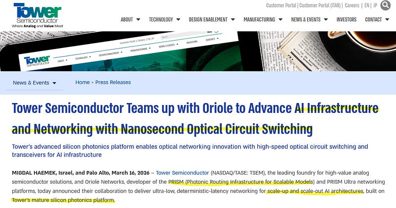 Tower Semiconductor (TSEM) and Oriole Networks announced a collaboration (March 16, timed to OFC 2026) to commercialize nanosecond-speed optical circuit switching (OCS) on Tower's SiPho foundry platform — targeting AI cluster networking.