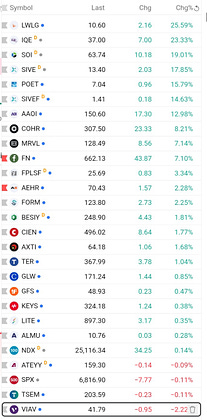 $LWLG: +25.59% $IQE: +23.33% $SOI: +19.01% $SIVE: +17.85% $POET: +15.79% $SIVEF: +14.63% $AAOI: +12.98% $COHR: +8.21% $MRVL: +7.14% $FN: +7.10% $FPLSF: +3.34% $AEHR: +2.28% $FORM: +2.25% $BESIY: +1.81% $CIEN: +1.77% $AXTI: +1.68% $TER: +1.04% $GLW: +0.85% $GFS: +0.47% $KEYS: +0.38% $LITE: +0.35% $ALMU: +0.28% $NDX: +0.14% $ATEYY: -0.09% $SPX: -0.11% $TSEM: -0.11% $VIAV: -2.22%