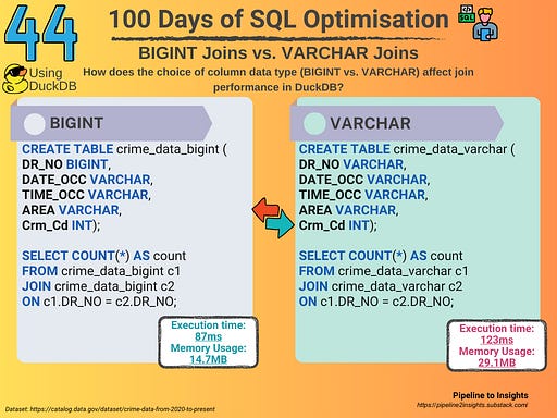 See how does the choice of column data type (BIGINT vs. VARCHAR) affect join performance in DuckDB!