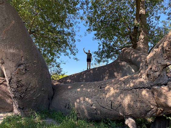 This fallen, but alive one is in northern Namibia and is more than 700 years old. We wild camped in its graceful shadows and this is me standing on its trunk, so you can see its true size.