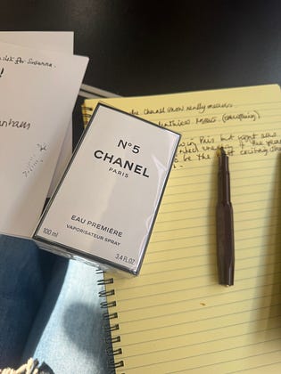 Writing on the Eurostar, covered in Eau Première from Duty Free. (This scent is Chanel No.5 +++.) Man opposite is slightly annoyed by spraying activity.