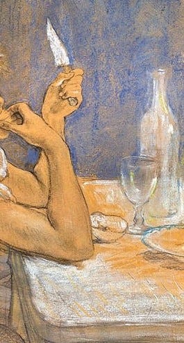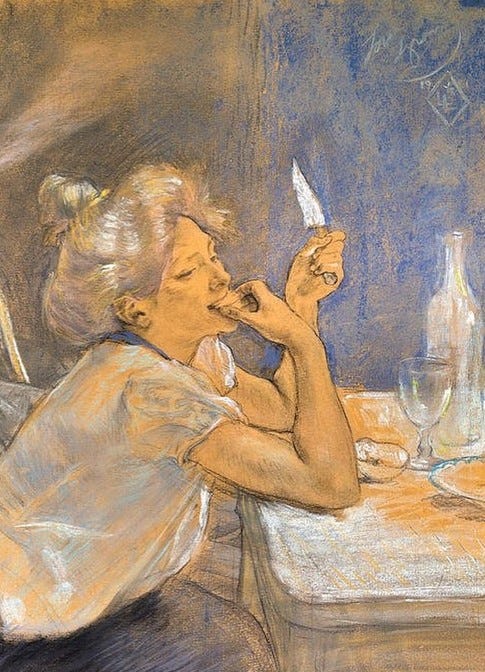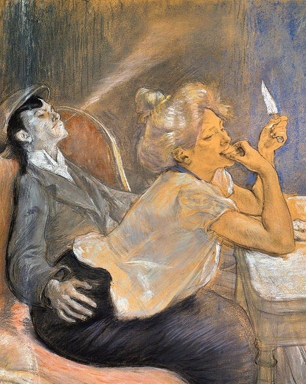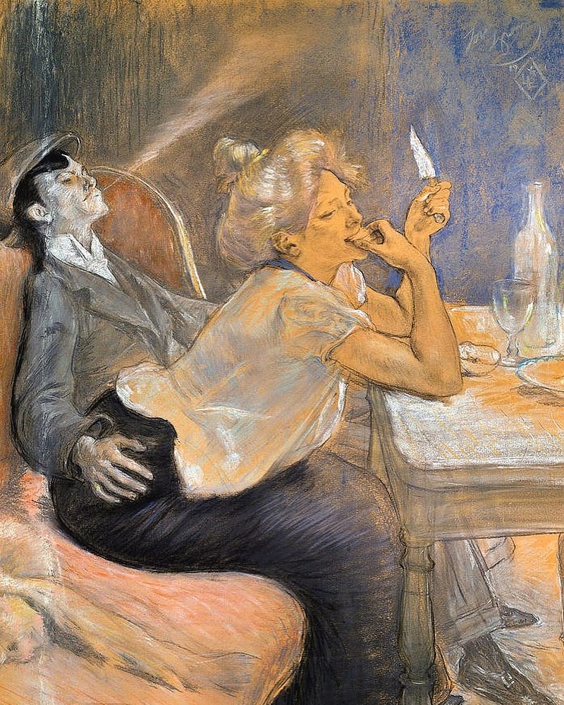 This is a beautiful pastel piece that pulls you right into a cosy, late-night moment in old Paris. In it, there's this dashing rogue of a man, one of those street-smart Apaches from the Belle Époque underworld, he is settled in close with his companion after their meal. He's got that classic flat cap tilted back, his face relaxed as he exhales a lazy plume of cigarette smoke toward the ceiling, and his hand rests on her hip, drawing them even nearer on the shared bench. His companion is this spirited woman with her blonde hair swept up in a bun, her blouse catching the soft glow of the light, and she's delighting in a fresh slice of fruit, holding a slender knife in one hand while she pops a piece into her mouth with the other. There's a bottle and glass on the table, a sign of the wine they've shared, and the whole thing feels like that perfect end to an evening full of stories and laughter.