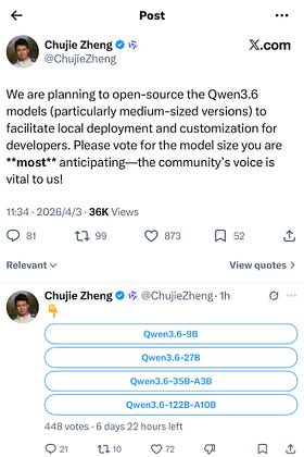 Alibaba is splitting Qwen into two tracks. Keep frontier models closed. Open-source the mid-size ones. Qwen 3.6 is the first signal. This mirrors Google’s playbook with Gemma vs. Gemini. My read: the Alibaba Token Hub strategy in action. Drive local deployment, capture downstream compute demand.