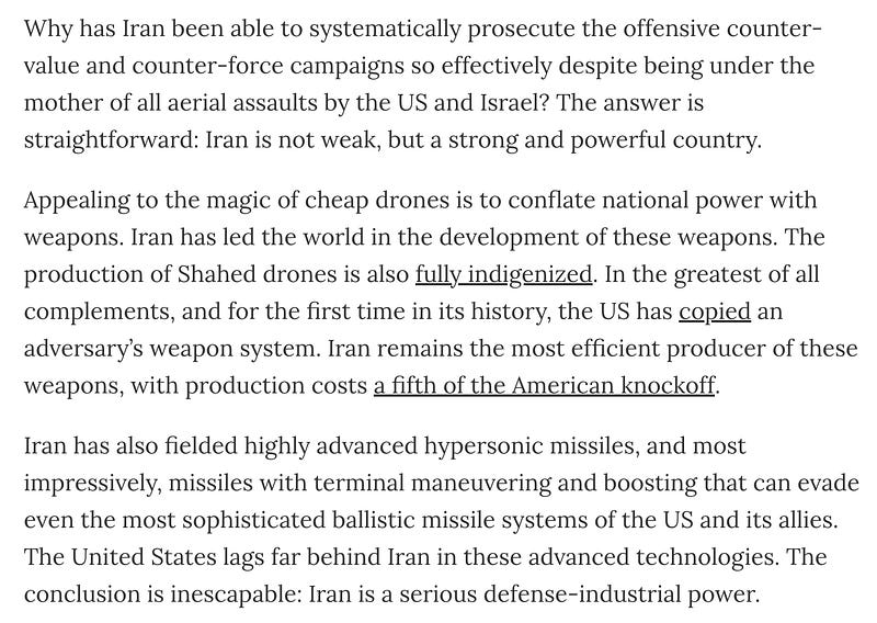This is a provocative piece from Policy Tensor suggesting that Iran should now be considered a Great Power for handing the United States and Israel a strategic defeat in this war. Most of the piece is paywalled, but I did want to make a few comments on the broader significance of the war, especially now that Trump is about to have his "Mission Accomp…