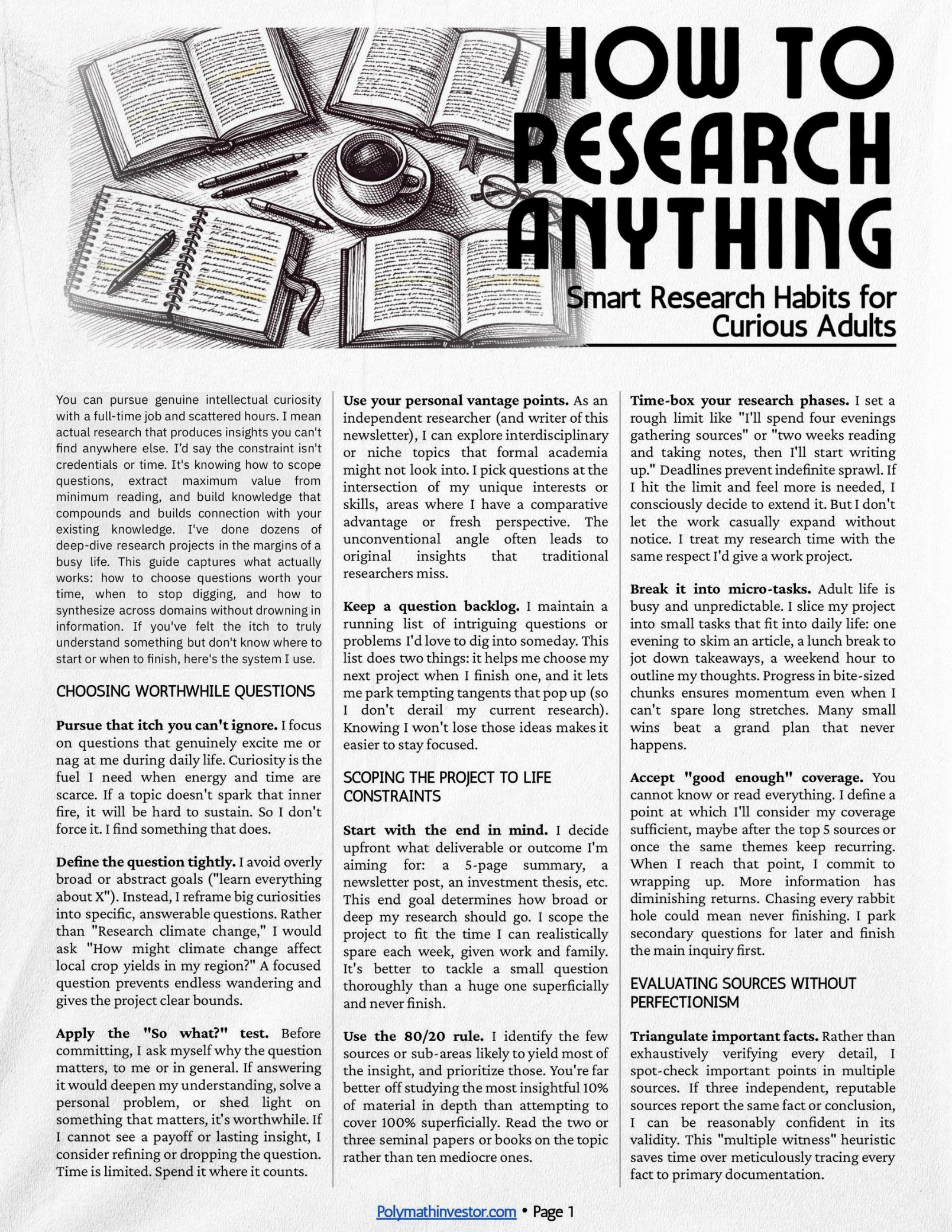 Many of you have asked about my research process. Here, I’m sharing some of the best practices I’ve picked up over time on how to research just about anything.