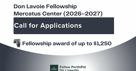 The Don Lavoie Fellowship, offered by the Mercatus Center, is a competitive, renewable, and entirely online semester-long program designed for advanced undergraduate students, recent graduates, and early-stage graduate students. The program is targeted at individuals from any academic discipline who are interested in political economy, specifically the Austrian, Virginia, and Bloomington schools of thought. The fellowship provides an award of up to $1,250, which includes a stipend, all required readings, and academic and professional advising.