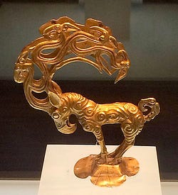 This gold stag with an eagle’s head, found in the Ordos Desert, is a representative of the new art form introduced by the Ordos nomads.
