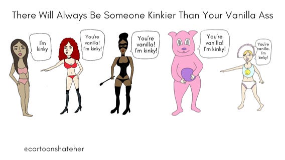 One thing I find annoying about any kind of “kink community” is how Reddity and gatekeeping it all is. Everyone is scared of being the least perverted, but then also insist we “normalize” everything under the sun so that really, nobody gets to be perverted.
