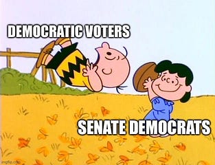 Where we are assuming naivety, we might instead assign cynicism. Instead of Senate Democrats whiffing once again, they were betting that their voters would believe this time would be different and play the role of old hapless Charlie Brown once again.