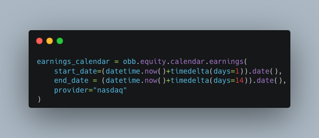 Next, use OpenBB to grab data on earnings announcements.