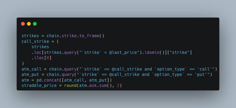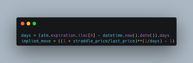 Finally, we’ll compute the implied price change of the stock based on the straddle price.