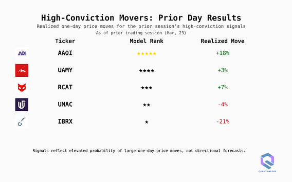 today’s next-day movers model flagged names that moved +18% and -21% (no earnings)