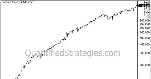 This simple mean reversion strategy has returnend 14.5% annnually (The chart shows SPY, but QQQ performs much better):