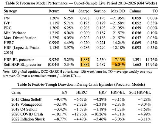 Preliminary precursor results (not yet full GARP): Sharpe of 1.887, max drawdown of -7.13% over 684 weeks out-of-sample, with a 75% drawdown reduction during the 2020 COVID crash relative to equal weighting.