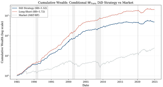 The interaction µ × WTrans yields a Fama-MacBeth t-statistic of 8.68 and a FF6-adjusted DiD alpha of +1.30%/month