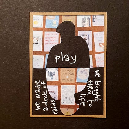 #100dayproject2026 day 11: play (making a deck of cards to explore pedagogy, teaching, learning and knowledge-making in the age of genAI; or card 4/7 based on the Workshop on workshops event I just attended). Reflection on how prompts (for human thinking, rather than for AI generation), play, and creativity allow us to explore complex questions. Also, reflection on working in different styles and media side by side, and organically bringing to life a collective creation.