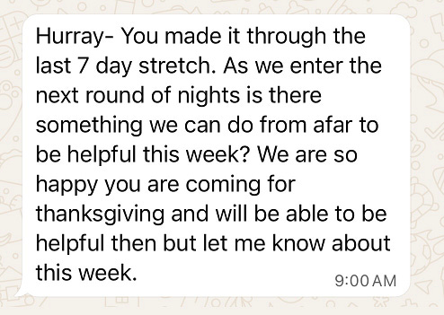 My husband (her son) is in his third year of medical residency — he’s currently on a grueling rotation and will soon transition to working two weeks of nights.