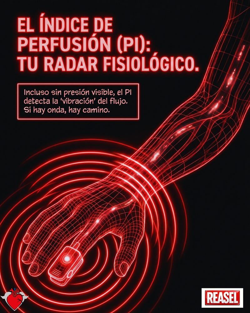Sin línea arterial, la reanimación suele ser un acto de fe. Pero hay un "radar" que muchos ignoran: El Índice de Perfusión (PI).