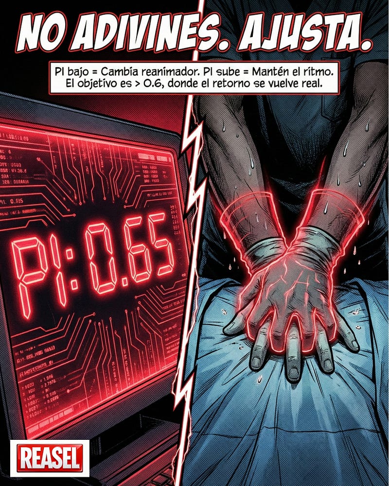 🎯 El número mágico: 0.6 No adivines. Ajusta. El estudio encontró que un PI > 0.6 se asocia con mayor probabilidad de Retorno de la Circulación Espontánea (RCE). Si el PI está en 0, quizás es "ruido infinito". Si el PI sube a 0.65 al cambiar de reanimador... eso es flujo real.