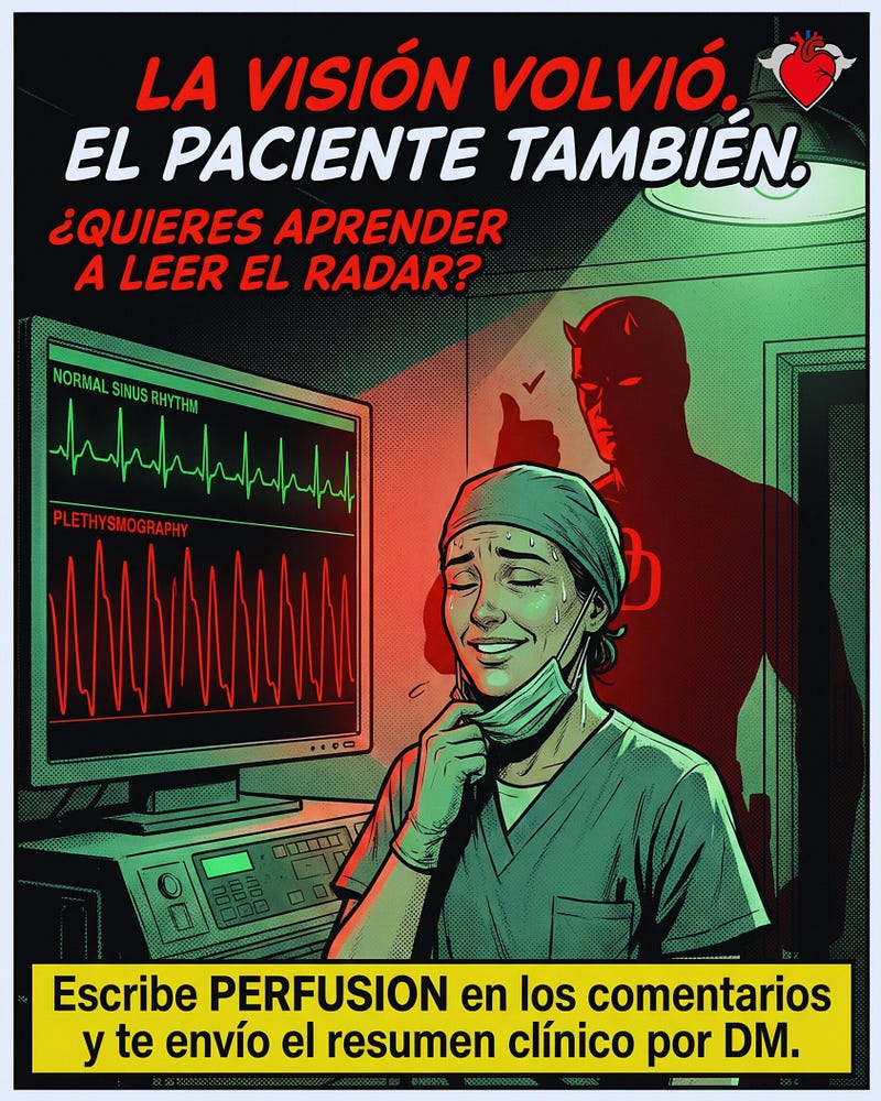 Esa frase cambia la atmósfera del quirófano. Santiago, 47 años, cirugía de rutina. Bradicardia súbita, asistolia. El monitor calla. La línea de pletismografía se aplana. No hay línea arterial. Solo están tus manos y una pregunta incómoda: ¿Estás perfundiendo o solo estás moviendo el tórax? 🚩