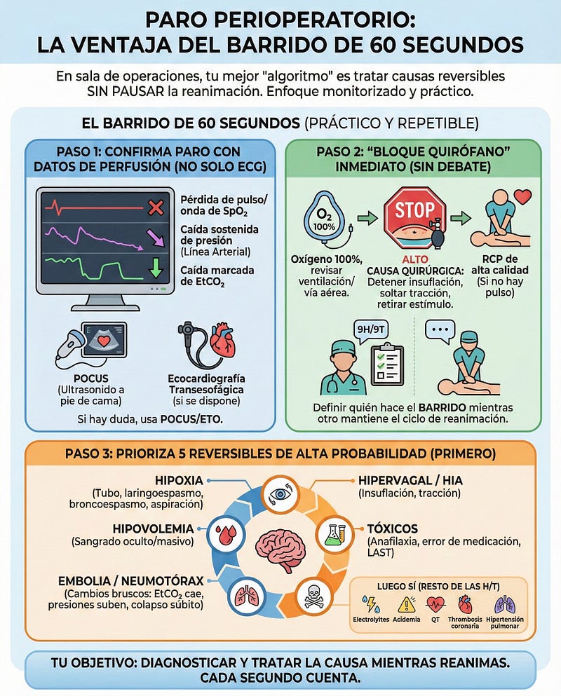 El objetivo es diagnosticar y tratar la causa reversible MIENTRAS reanimas. No pauses la RCP para pensar; piensa mientras diriges el equipo.