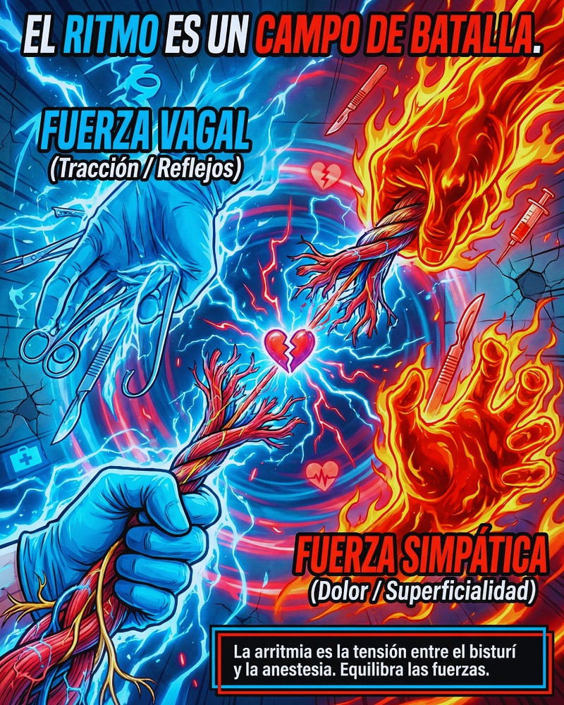 🔵 La Fuerza Vagal (El freno): La tracción del cirujano, la manipulación del peritoneo, los reflejos oculocardíacos o una anestesia demasiado profunda. El resultado: el corazón se "apaga" (bradicardia, pausas).