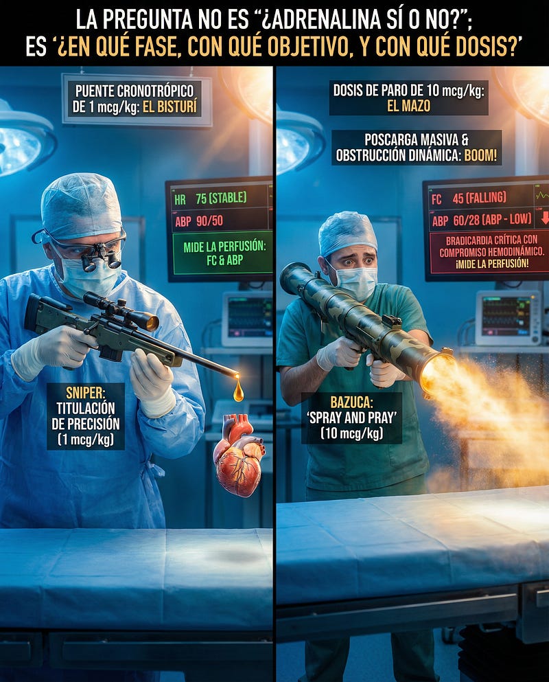 💥 LA BAZUCA (10 mcg/kg - Dosis de paro): Usar la dosis completa cuando aún hay perfusión es hacer un "spray and pray". Sí, vas a generar un impacto, pero a un costo altísimo: aumento masivo y brusco de la poscarga, caos metabólico y un riesgo enorme de provocar una obstrucción dinámica del tracto de salida. Es fuerza bruta innecesaria.