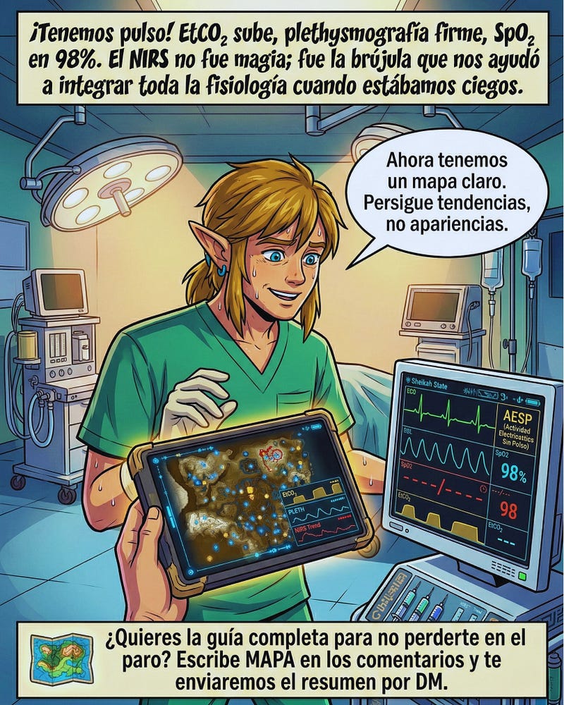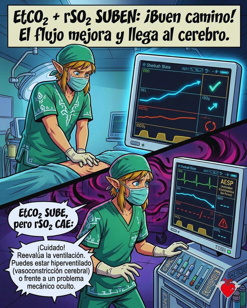 En quirófano necesitamos integrar tendencias para confirmar si nuestras intervenciones acercan al paciente al RCE. Así como Link usa su Sensor Sheikah para orientarse, nosotros usamos el binomio EtCO₂ + NIRS (rSO₂). No buscamos un "número mágico", buscamos coherencia fisiológica. 🧠🩸