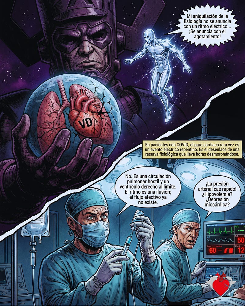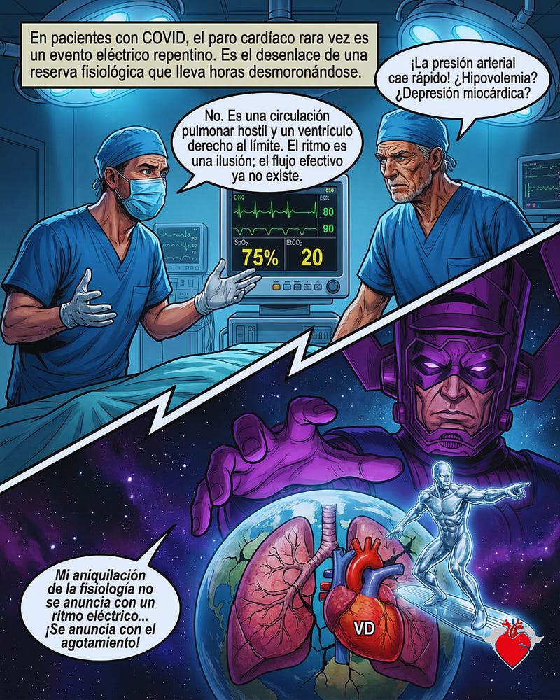Como el Silver Surfer, el ritmo en el monitor solo nos avisa de lo inevitable. El verdadero destructor (nuestro Galactus) es la fisiopatología subyacente que ya estaba devorando al paciente: