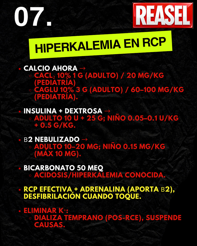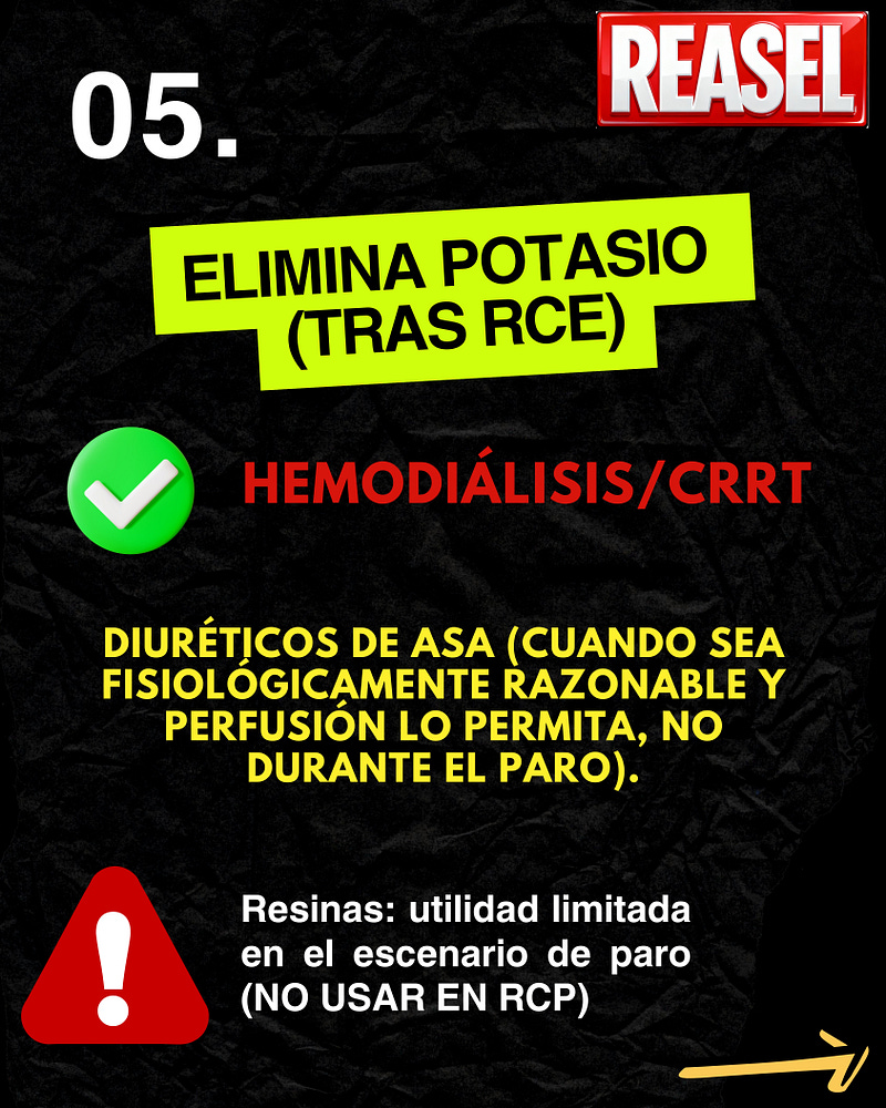 4️⃣ Elimina (Post-RCE): La diálisis o los diuréticos van después de que el paciente recupera el pulso. (Las resinas no tienen lugar durante el paro).