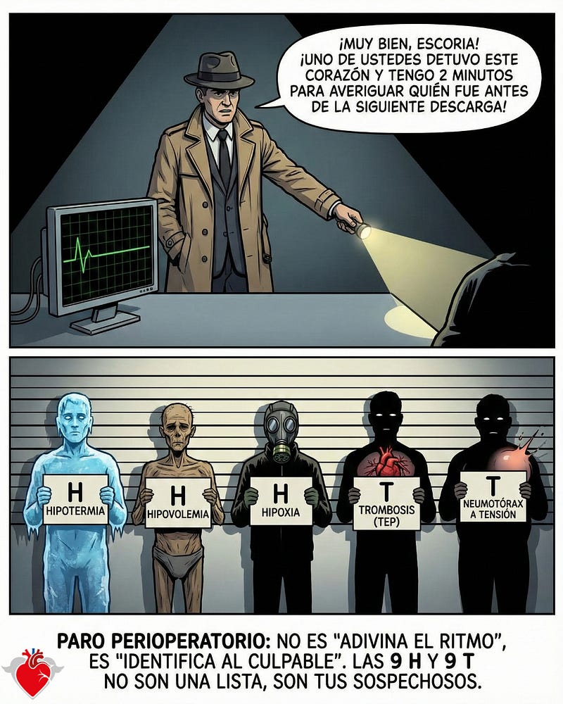 En el paro perioperatorio, el monitor solo te avisa que el corazón se detuvo, pero no te dice quién lo hizo. Tienes minutos vitales para encender la linterna de la fisiología y hacer tu interrogatorio.