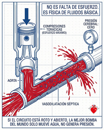En sepsis, los vasos sanguíneos tienen "fugas" (vasoplejía) y no "oyen" la adrenalina sola. Las compresiones torácicas no pueden generar presión coronaria. ¡Es como intentar inflar un globo pinchado!🎈