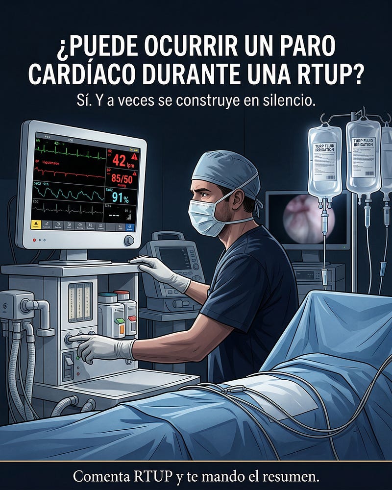 Como hoy vemos menos el síndrome clásico, es fácil bajar la guardia. Pero menos frecuente no significa menos peligroso. En una RTUP, el deterioro puede construirse en silencio: absorción de irrigación, sobrecarga, crisis de precarga bajo neuroaxial, bradicardia profunda, acidosis… y de pronto el monitor empieza a contar una historia que el equipo todavía no termina de nombrar.