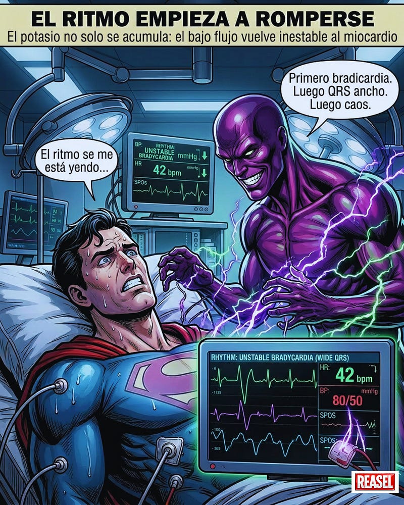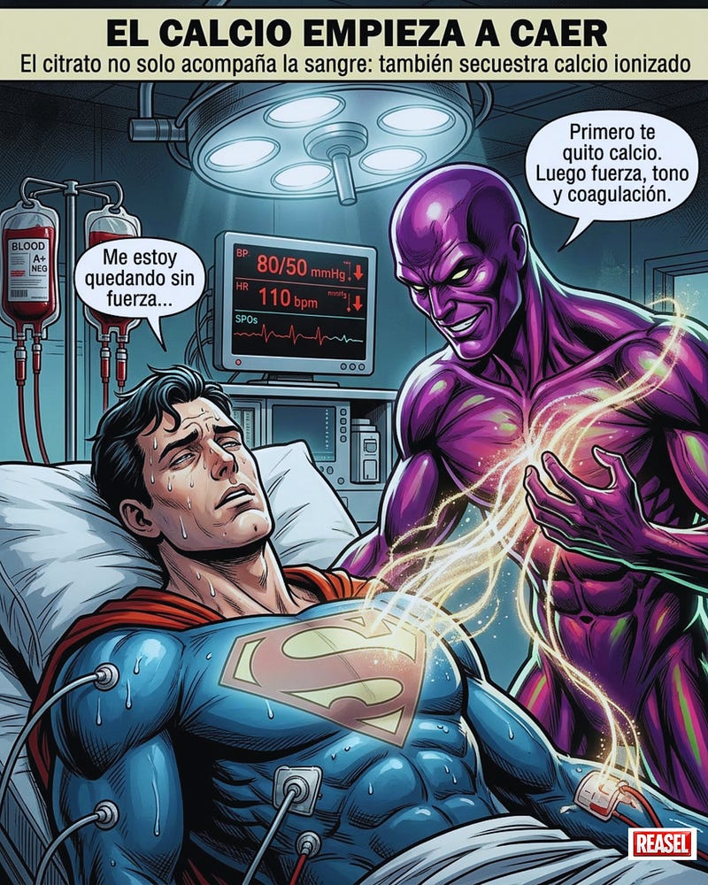 Cuando el citrato secuestra calcio ionizado, cae la contractilidad, se pierde tono vascular y la coagulación se vuelve más frágil. Cuando el potasio entra rápido sobre un terreno de bajo flujo, acidosis e hipotermia, el miocardio empieza a volverse eléctricamente inestable.