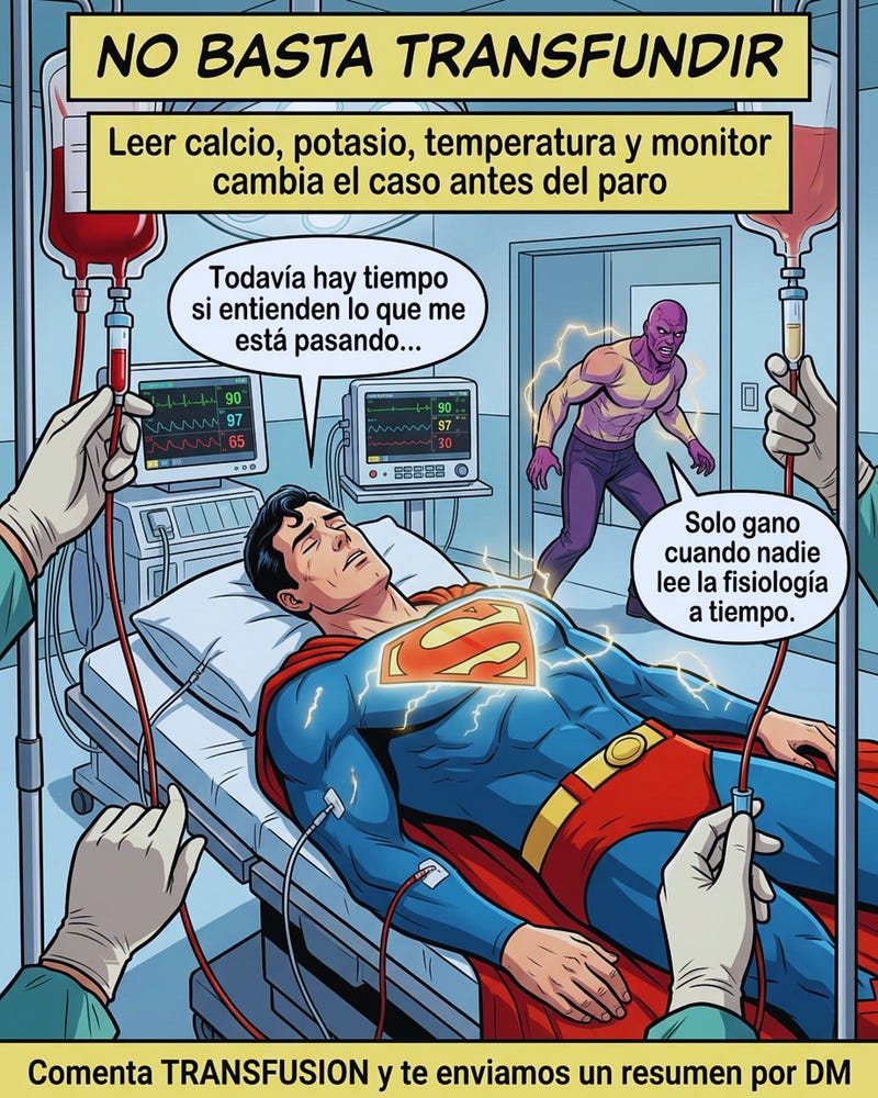 Por eso, en quirófano no basta con transfundir. Hay que leer la fisiología en tiempo real: monitor, calcio, potasio, temperatura y causa hemorrágica, todo al mismo tiempo.