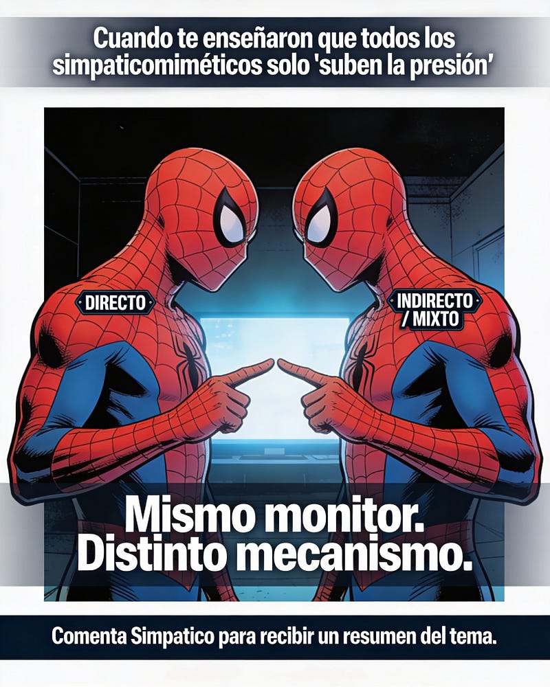 Un simpaticomimético puede actuar directo sobre el receptor, aumentar catecolaminas endógenas o combinar ambas vías. Esa diferencia no es académica: cambia la velocidad de respuesta, su estabilidad, la posibilidad de taquifilaxia, las interacciones y, sobre todo, la lógica con la que debes elegirlo en quirófano, urgencias o cuidados críticos.