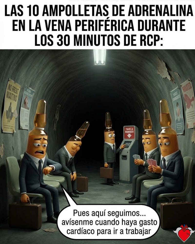 Podemos pasar el carro rojo entero por esa vena periférica, pero si tus compresiones son inefectivas, o peor aún, si tienes al paciente hiperventilado creando Auto-PEEP y estrangulando el retorno venoso... la adrenalina se va a quedar ahí, sentada en la sala de espera venosa jugando baraja. 🃏💉