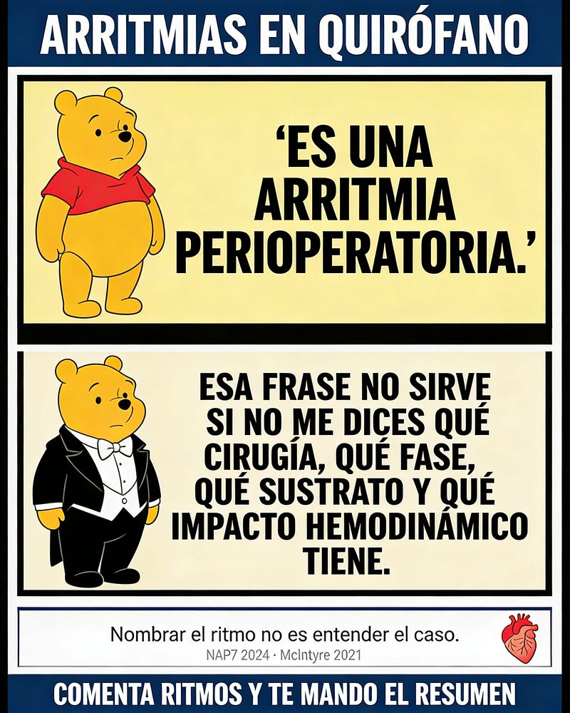 Porque esa frase, por sí sola, no te dice si estás viendo una extrasístole banal en laringoscopia, una bradicardia refleja en insuflación, una FA en cirugía torácica o una FV en reperfusión. Y meter todo eso en el mismo saco no es síntesis clínica. Es pereza con vocabulario bonito.