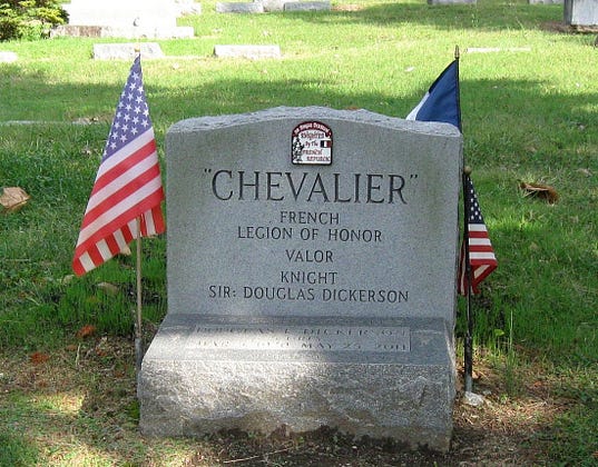 France awarded him the Croix de Guerre, and in 2004 conferred the title of Chevalier (Knight) in the Légion d’Honneur, hence “Sir” on his tombstone