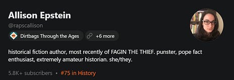 (Technically this is “ranked 75 in the sub-category of History-themed substacks” and not “75th best substack in all of human history” but that does clearly read “#75 IN HISTORY” and you can interpret that any way you so choose.)