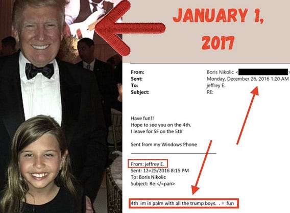 HERE’S the email we’ve been waiting for. Epstein brags he was hanging out with “all the Trump boys” in Palm Beach in January 2017. And the photograph shows Donald Trump was in Palm Beach Jan. 1, 2017. This was long after his sex crimes were exposed! Make sure this gets around!