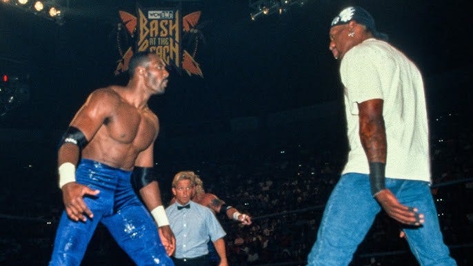As Rodman’s then-agent Dwight Manley told me, this was Rodman’s plan to both promote the match and, more importantly, to “disarm” Malone in the biggest game of his life. Full interview here:
