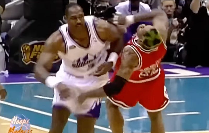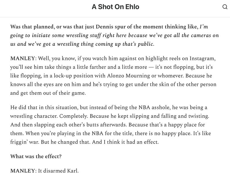MANLEY: That’s exactly what it was, and Dennis started it.That’s his sixth sense: pushing things. And he did. And he conflated the wrestling and the NBA on primetime at crunch time. And whether that disarmed Karl a little bit, for the game, or however, but that was a major tweak.